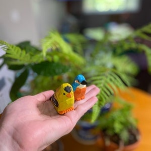 The bird is carefully carved from genuine Maple wood and hand painted with vibrant colors that attempt to match nature's beauty. The little eyes are also carefully made of glass.