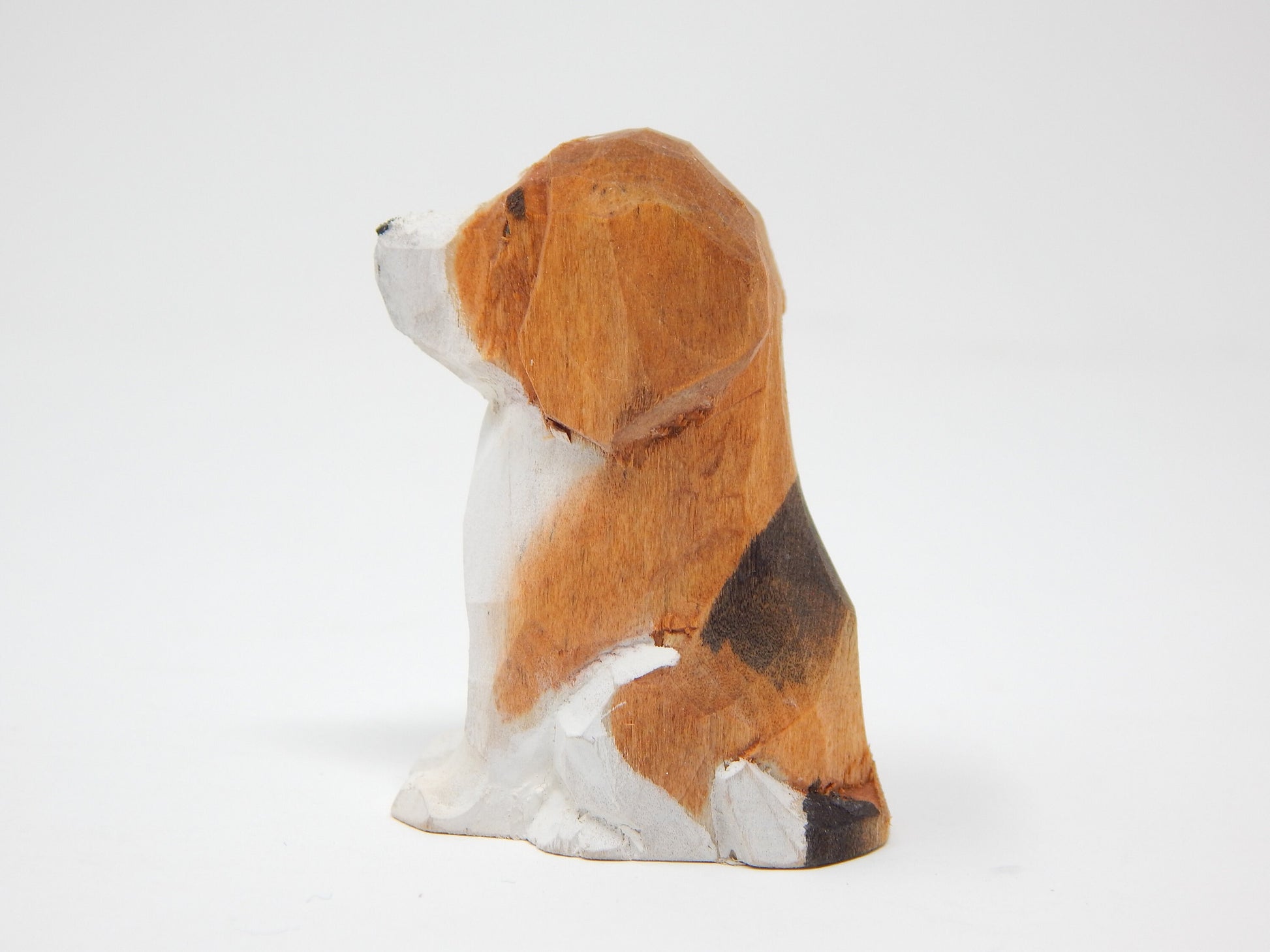 The beagle is carefully carved from recycled wood and hand painted with vibrant colors that attempt to match nature's beauty. The little eyes are also carefully made of glass.