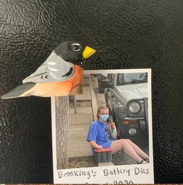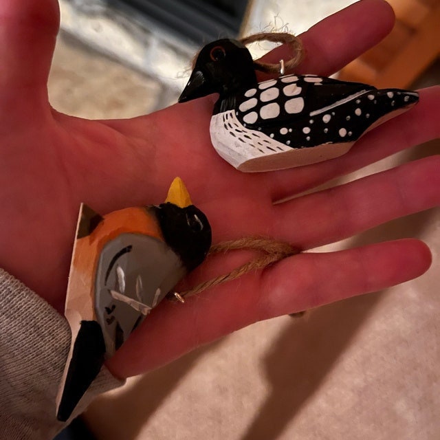 The bird is carefully carved from recycled wood and hand painted in non-toxic paint with vibrant colors that attempt to match nature's beauty. The little eyes are also carefully made of glass. This is a cute little bird that measures about 2 inches. Each bird is uniquely hand painted, so there are small variations between each one.